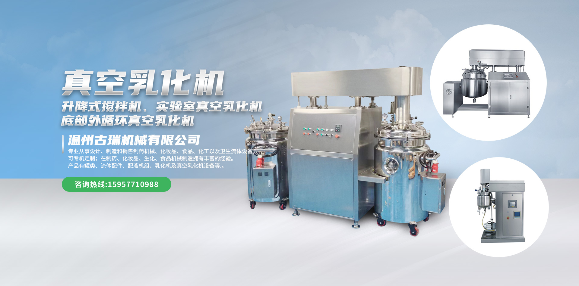 溫州古瑞機械有限公司專業從事設計、制造和銷售制藥機械、化妝品、食品、化工以及衛生流體設備,可專機定制;在制藥、化妝品、生化、食品機械制造擁有豐富的經驗。產品有罐類、流體配件、配液機組、乳化機及真空乳化機設備等,咨詢電話:15957710988